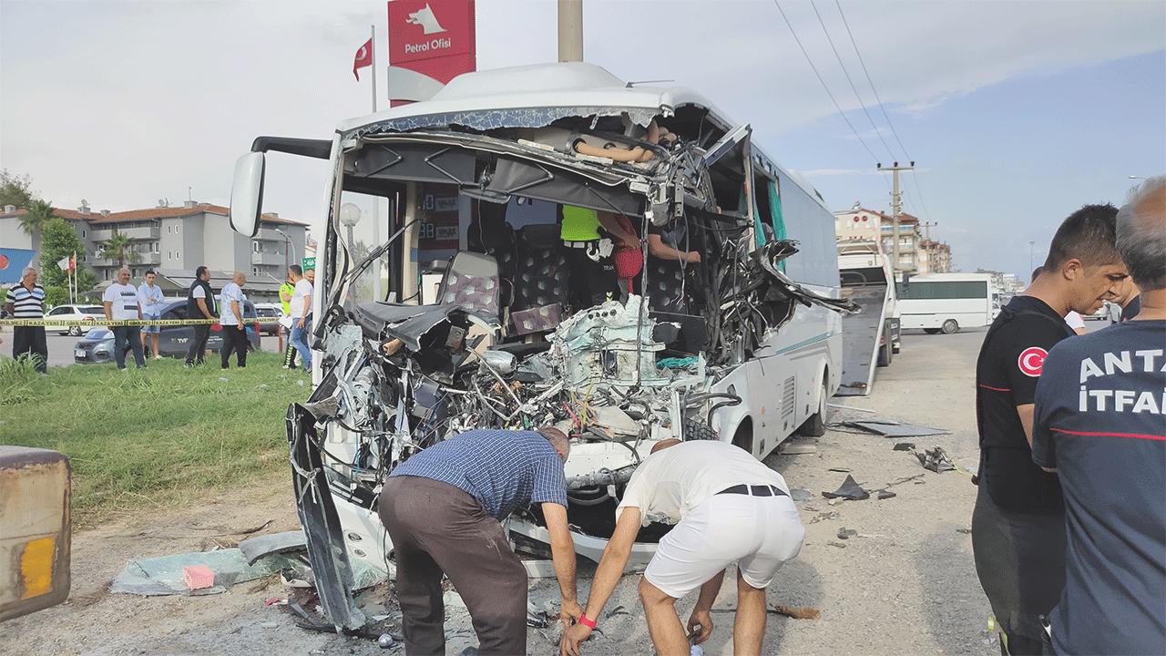 Alanya bölgesindeki otellerden aldığı turistleri Antalya Havalimanı’na götüren Nuri Okudan idaresindeki plakası öğrenilemeyen çeşit minibüsü, Ilıca Kavşağı’nda bir akaryakıt istasyonu önünde park halindeki tıra çarptı.