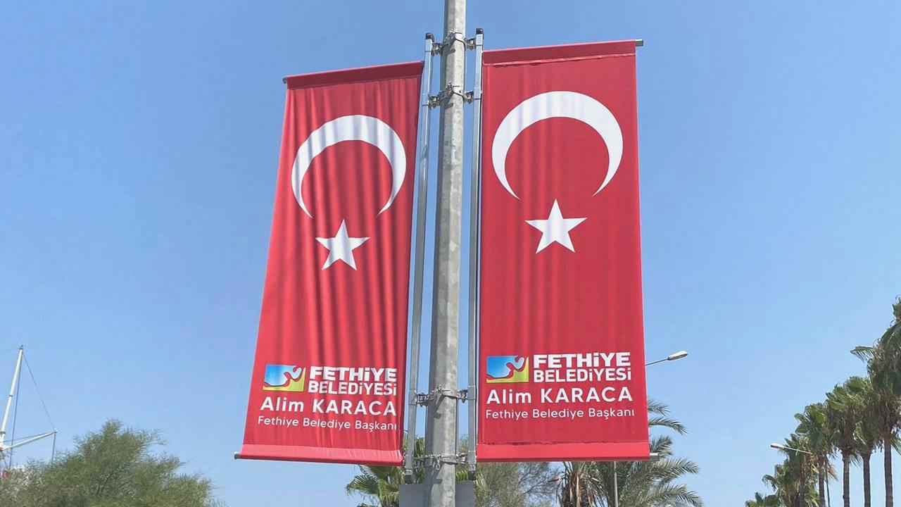 Muğla Valiliği’nden yapılan açıklamada, ilçede ana caddelerdeki elektrik direklerinde bulunan reklam panolarına bayrak üzerinde belediye liderinin ismi ile Fethiye Belediyesi logosunun yer aldığı görsellerin asıldığının tespit edildiği bildirildi.